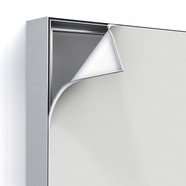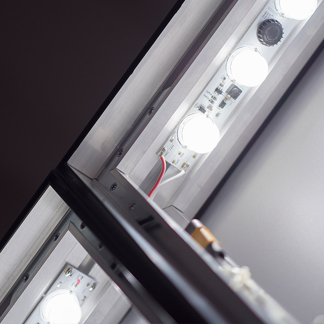 Edge lighting is a system mounted on the edges of the frame that directs light into the interior of the frame, illuminating the graphic from within. It is particularly effective in double-sided frames and displays that require uniform illumination without the use of rigid back panels.