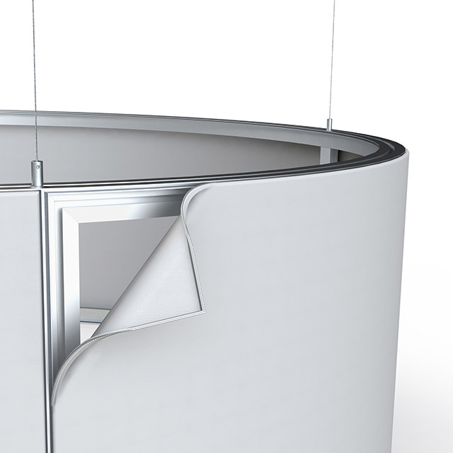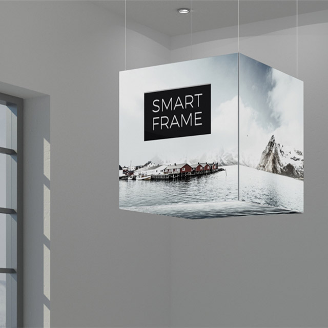 Podwieszane ramy z grafiką na tkaninach napinanych pozwalają tworzyć atrakcyjne wizualnie, funkcjonalne, a przy tym lekkie formy przestrzenne. Podwieszenia są bardzo proste w montażu i demontażu. Można korzystać z nich wielokrotnie i dowolnie wymieniać tkaninę z grafiką, dopasowując ją na potrzeby aktualnych wydarzeń, zmieniającej się oferty czy sezonu.